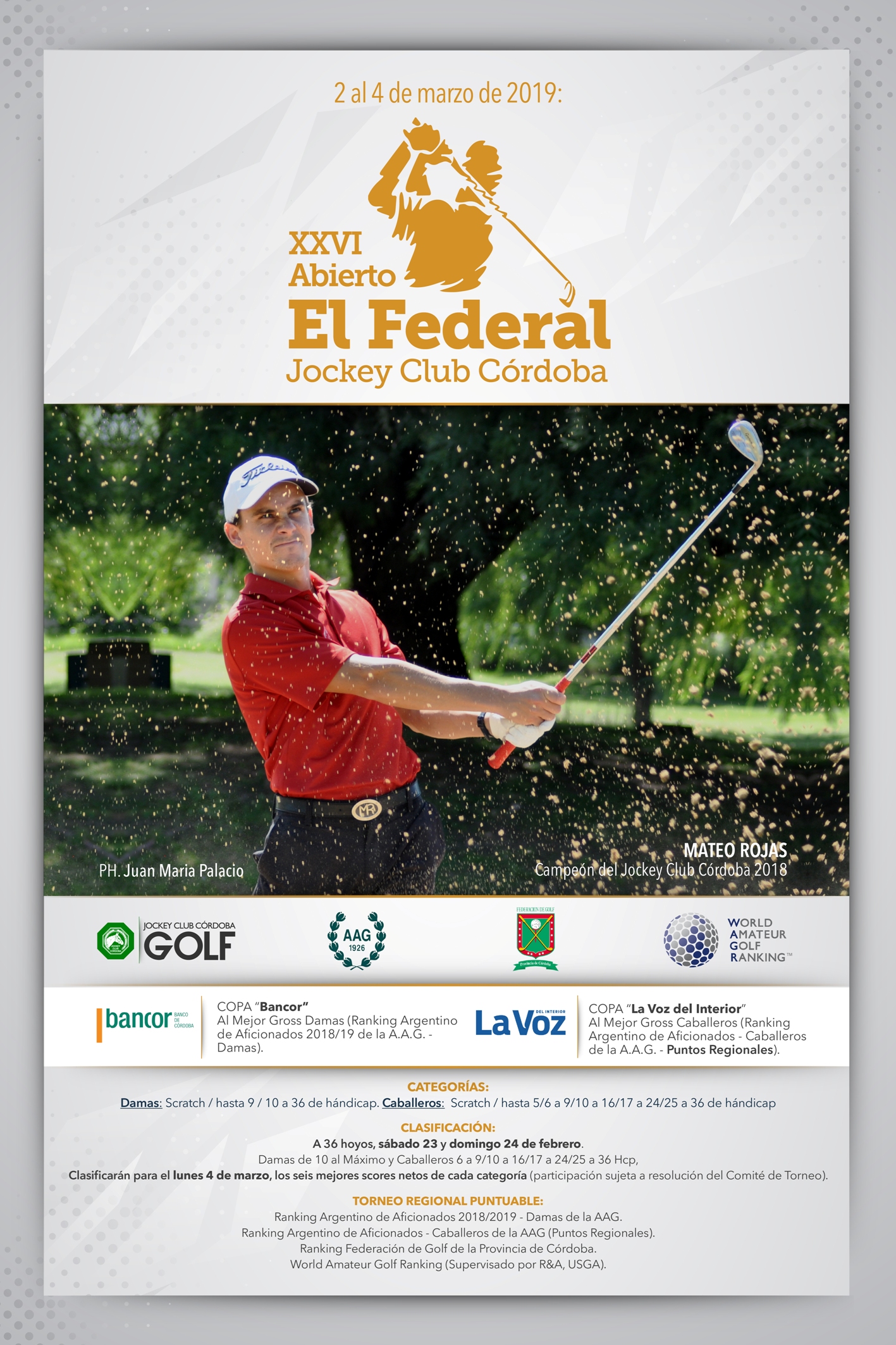 Previamente a la fecha señalada, el sábado 23 y domingo 24 de febrero, Damas de 10 a 36 y los Caballeros de 6 a 9, 10 a 16, 17 a 24 y 25 a 36, jugaran también el Abierto El Federal, en sus respectivas Categorías, competencia que será clasificatoria, que les permitirá jugar los 18 hoyos finales el lunes 4 de marzo.