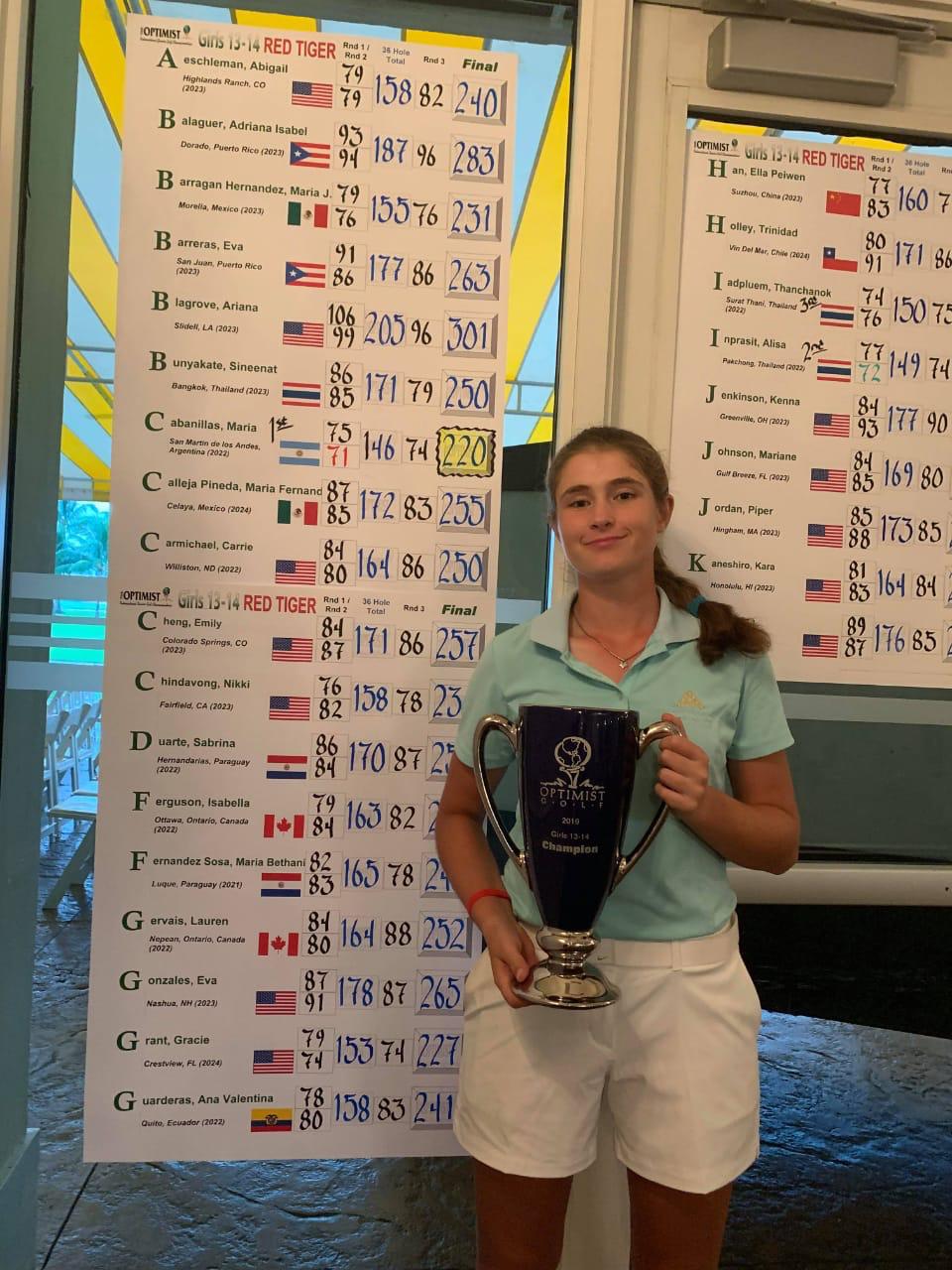 María Cabanillas se consagró como la vencedora en los Optimist International Junior Golf Championships en la categoría de 13 y 14 años, después de dar pelea entre los puestos principales de la competencia, liderados durante las dos primeras vueltas por su compatriota Josefina Rendo. Con una vuelta final de 74 golpes, la jugadora de Chapelco Golf Club, que lidera el Ranking Argentino de Menores de 15 con tres triunfos en tres torneos, sumó 220 para aventajar por tres a su escolta más cercana. Rendo, de gran desempeño en el certamen, finalizó cuarta con 225, en tanto en Caballeros de 14 y 15 años, Guillermo Polo Bodart fue el argentino con mejor registro al acumular 230 golpes. La última fase es la de las categorías 16 a 18 y 15 a 18 en Varones y Damas, respectivamente. El Trump National Doral Resort and Spa es el ámbito del certamen.