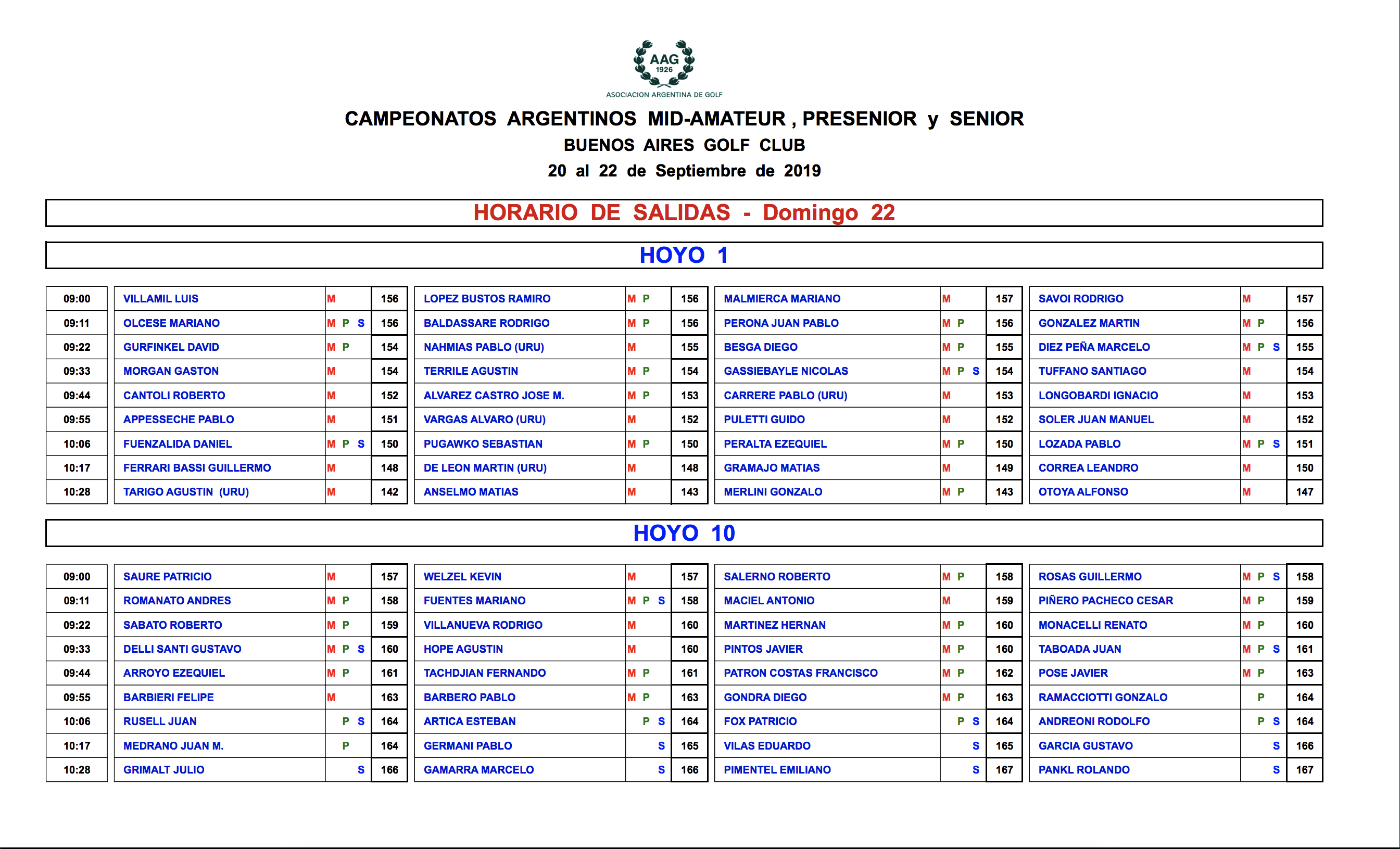 El uruguayo Agustín Tarigo se mantiene al frente del Campeonato Argentino Mid-Amateur que se disputa en el Buenos Aires GC y que culmina mañana, también con la temporada 2019. Hoy, su recorrido se integró de birdies en el hoyo 2, el 8 y 11; su marcha podría haber sido aun mejor de no mediar el doble bogey al 15 que lo dejó con 71 golpes igual que ayer y con un total de 142, -2. A tan solo un golpe de él se encuentran Matías Anselmo y Gonzalo Merlini, que hicieron 69 y 71, mientras que el cuarto puesto corresponde a Alfonso Otoya Ventureira con 147 golpes, 74 para el día.