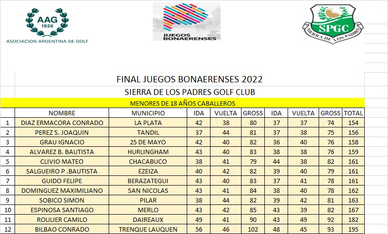 Sierra de los Padres GC ofició como el escenario de la última etapa de los Juegos Bonaerenses. La competencia se desarrolló a treinta y seis golpes y finalizó este miércoles con la consagración de Conrado Díaz Ermacora en Menores y Gonzalo Gimenez Quiroga en Menores de 15 años.